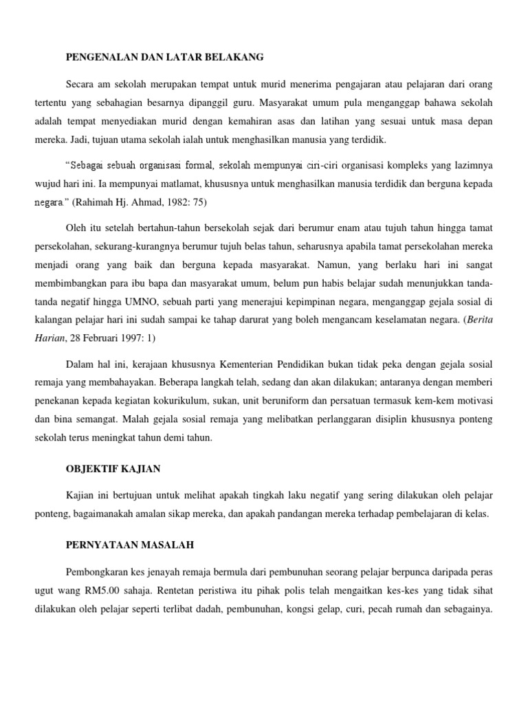 Objektif Kajian Kajian ini dijalankan untuk memperolehi dapatan dalam menangani masalah ponteng sekolah. Karangan - Gejala Ponteng Dalam Kalangan Pelajar Ponteng merupakan kekangan disiplin yang paling banyak berlaku dan sukar diatasi di sekolah. Kajian menunjukkan bahawa ponteng sekolah adalah tanda-tanda awal yang.